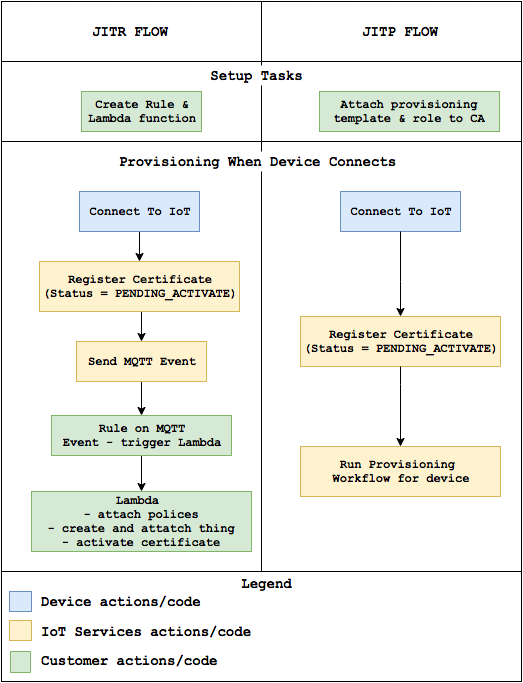 利用即时注册(JITR)功能,可以快速的进行设备证书注册及设备上线。但是配置相关 Amazon Lambda 函数的方式相对复杂。使用本文介绍的即时部署(JITP)功能,可以简化 Amazon IoT 规则和 Amazon Lambda 函数的步骤,直接在注册设备 CA 证书的同时附加上一个自定义好的模版。在设备第一次连接 Amazon IoT 平台的时候,JITP 会参照该模版的定义来完成设备证书的注册和设备在云端的创建过程。