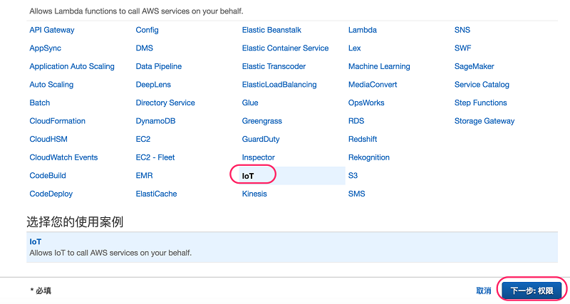 3.在创建角色页面选择“亚马逊云科技产品”中的 Amazon IoT,然后点击”下一步:权限”。