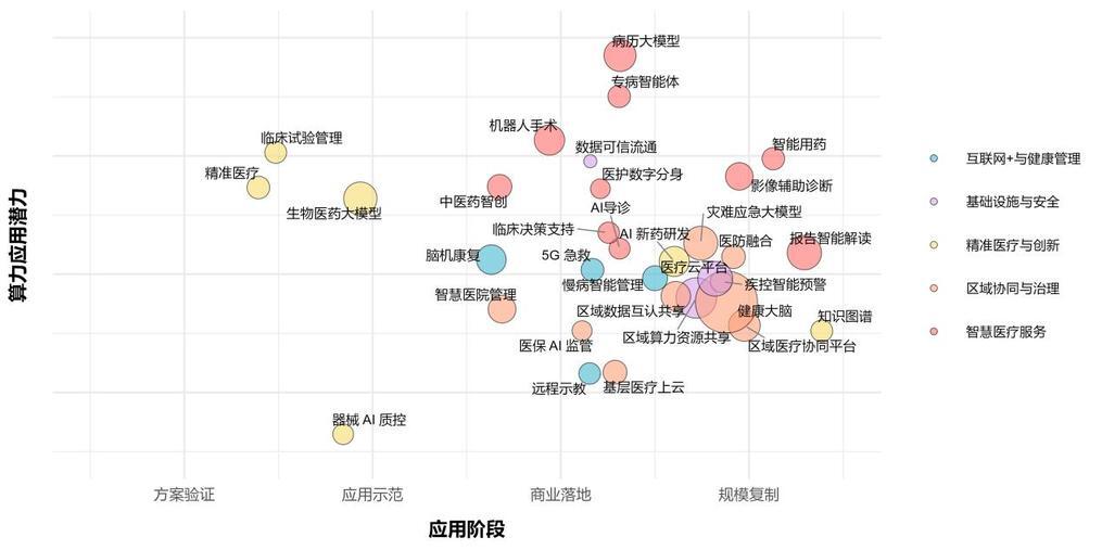 算力部署遵循临床需求明确、数据获取成熟、风险可控的前提。病历生成、影像辅助诊断等标准化程度高的场景率先落地,手术导航、新药研发等前沿场景潜力巨大。