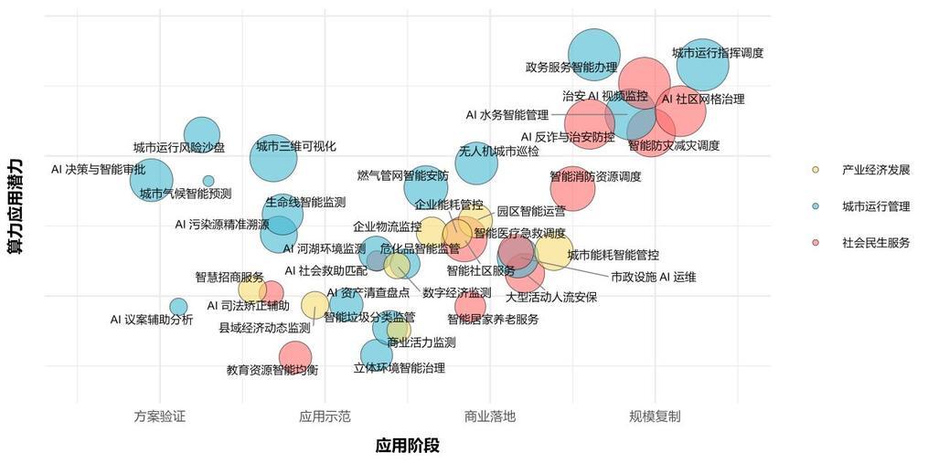 算力应用沿感知智能化、运行一体化和决策智能化方向发展。政务服务、治安防控等民生服务与城市中枢运行场景承担了主要算力负载。