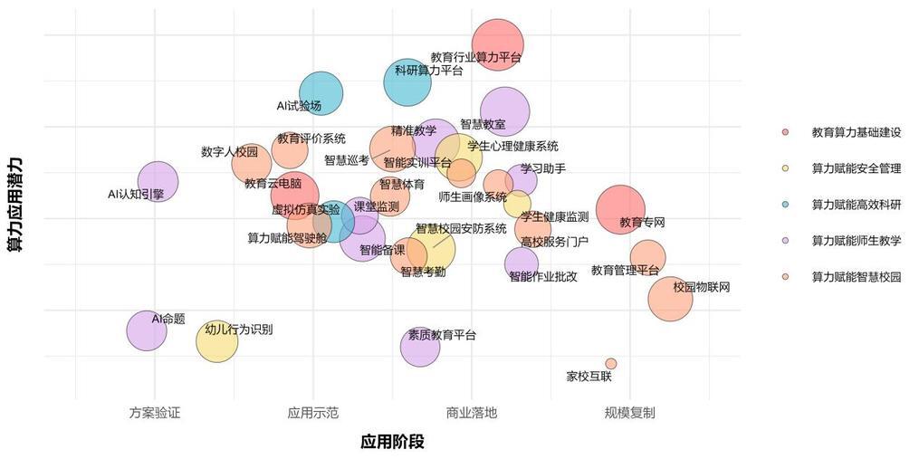 算力应用从校园管理走向教学核心。智慧校园、智能考勤等管理场景已规模复制,而 AI 命题、AI 认知引擎等直接触及教学核心的场景仍处于示范探索阶段。