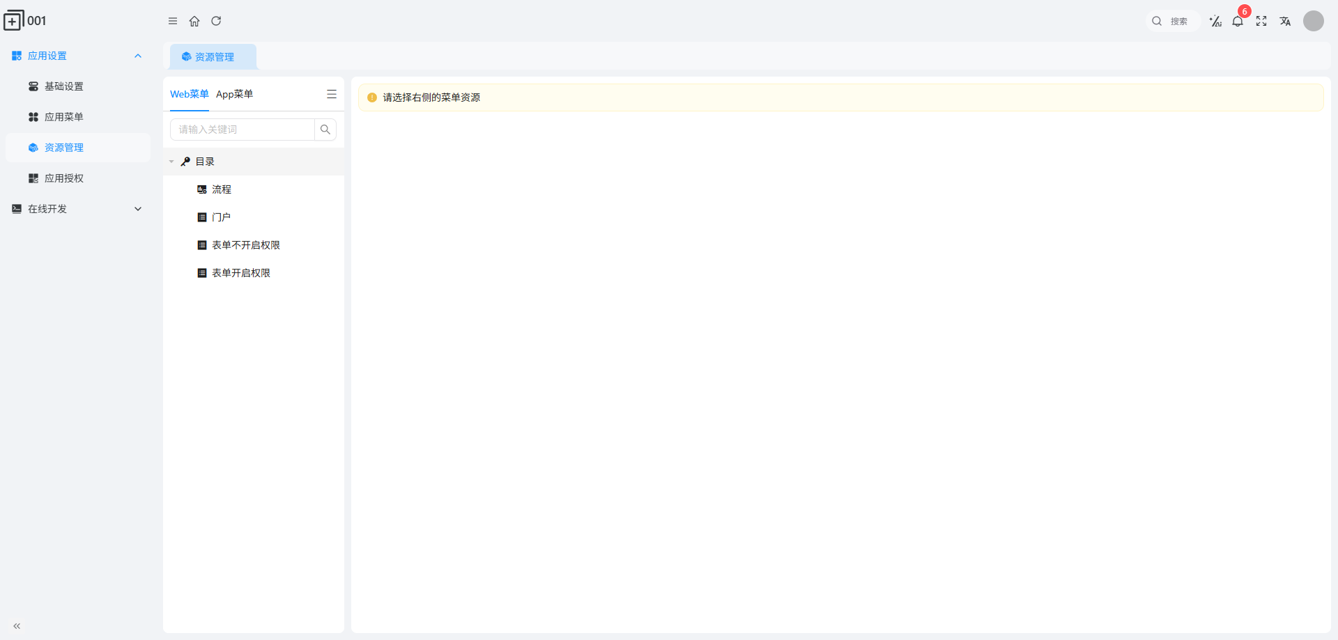 “资源管理” 的操作入口很固定:进入目标应用后台(应用中心点击应用图标),在 “应用设置” 里找到 “资源管理”,页面默认分 “Web 菜单” 和 “App 菜单” 标签,切换即可管理对应端权限。
