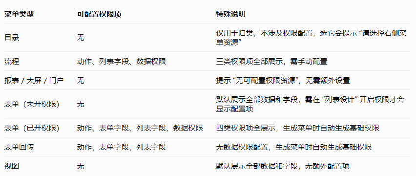 选了菜单但没看到权限配置项?先看菜单类型:目录、报表、大屏等类型本就无配置项;表单类型要先在 “列表设计” 中开启权限,否则也看不到,按菜单类型对应规则排查即可。
