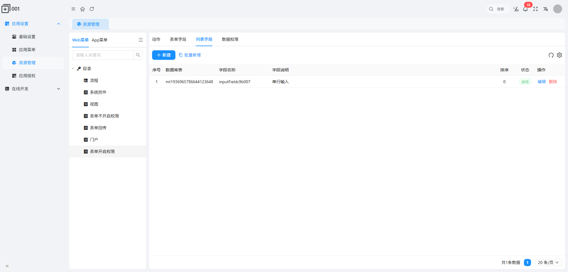 资源管理的核心是 “动作、表单字段、列表字段、数据权限” 四类配置,仅在特定菜单类型下可见,按场景拆解如下: