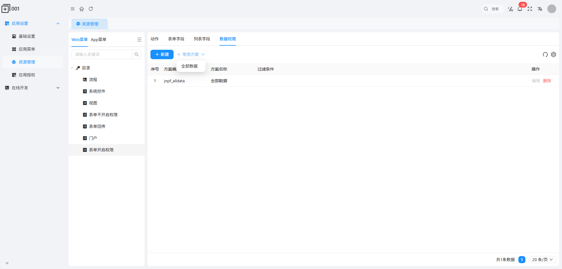 关键提醒:表单回传类型菜单不会自动生成数据权限方案,需手动配置;“全部数据” 方案可通过 “+ 常用方案” 快速添加。