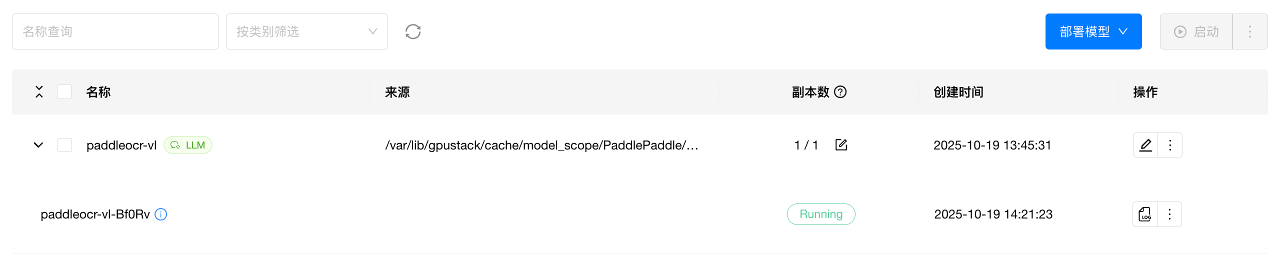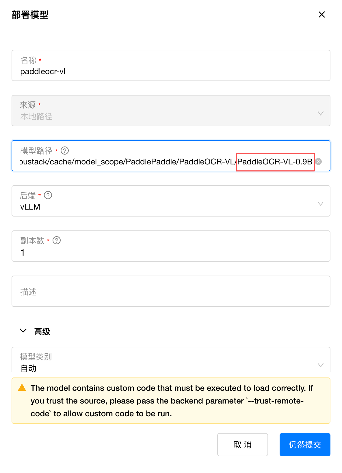 确认模型下载完成后,点击模型文件右侧的部署按钮,部署模型。由于 PaddleOCR-VL-0.9B 模型位于下载的模型目录的 PaddleOCR-VL-0.9B 子目录下,需要修改为指向该目录进行部署。