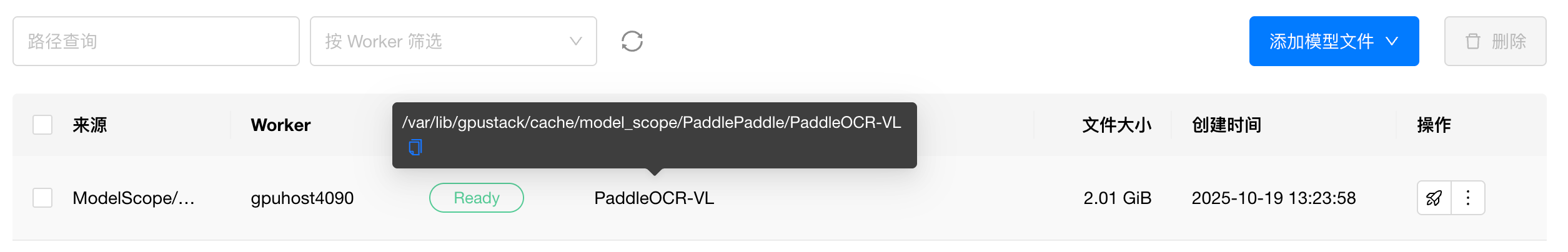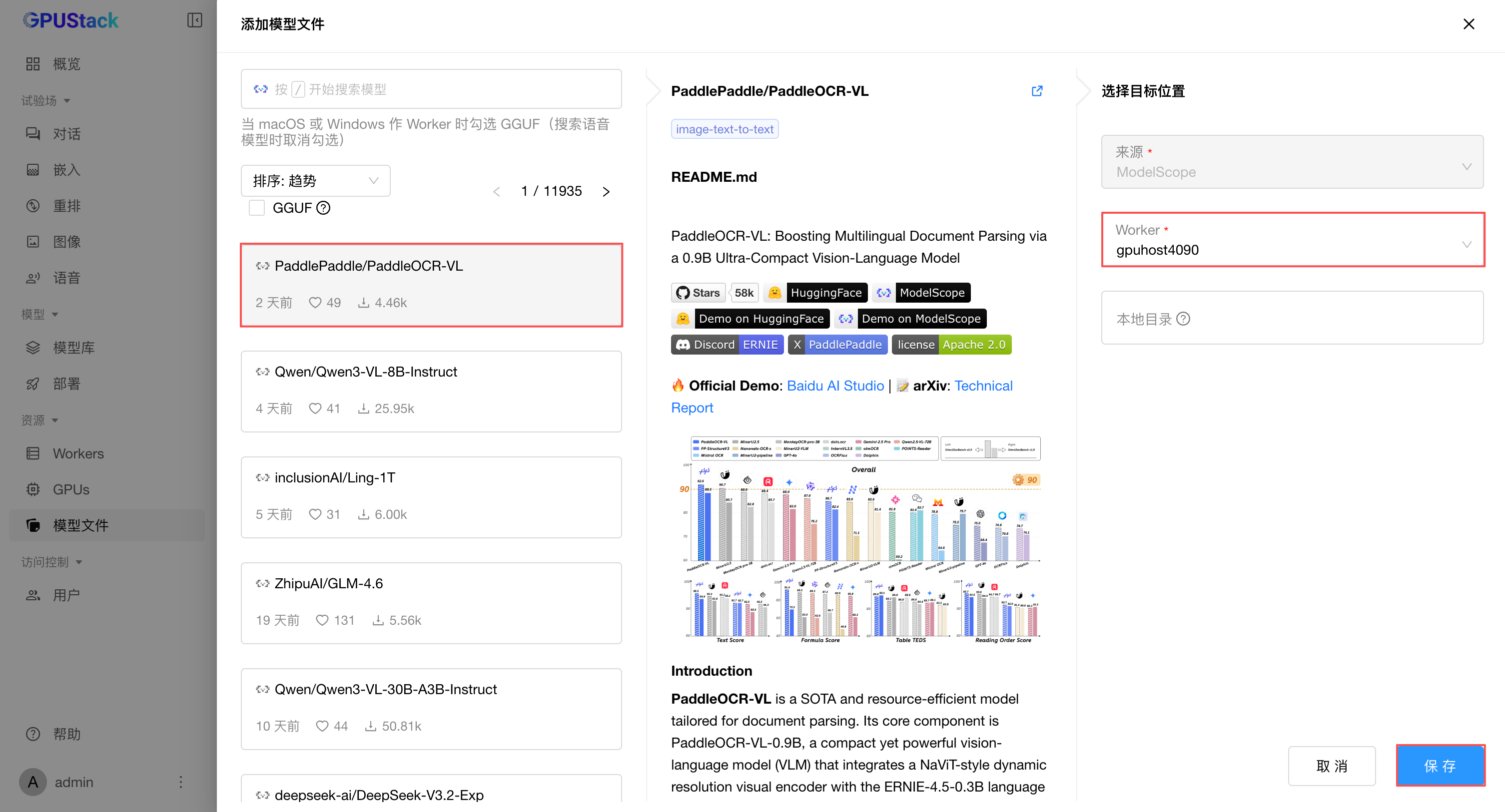 在 GPUStack UI,导航到 资源 - 模型文件,选择添加模型文件,可以选择从 Hugging Face 或 ModelScope 联网搜索并下载 PaddleOCR-VL 模型。国内网络建议从 ModelScope 下载: