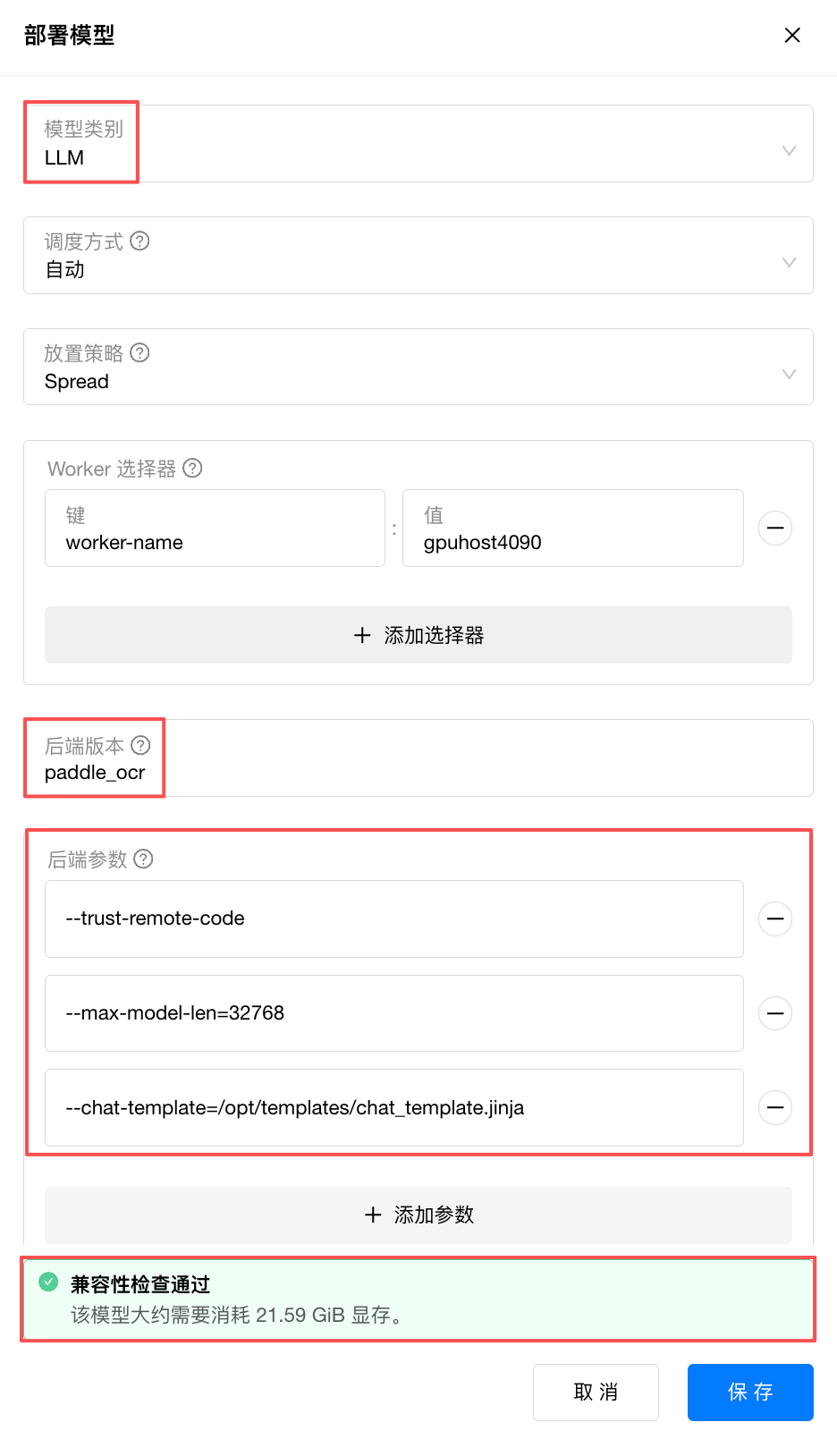 展开高级配置,设置模型类别为 LLM。在后端版本中,填写自定义的后端版本为 paddle_ocr(指向前面步骤软链的 /var/lib/gpustack/bin/vllm_paddle_ocr),GPUStack 会自动调用运行模型。