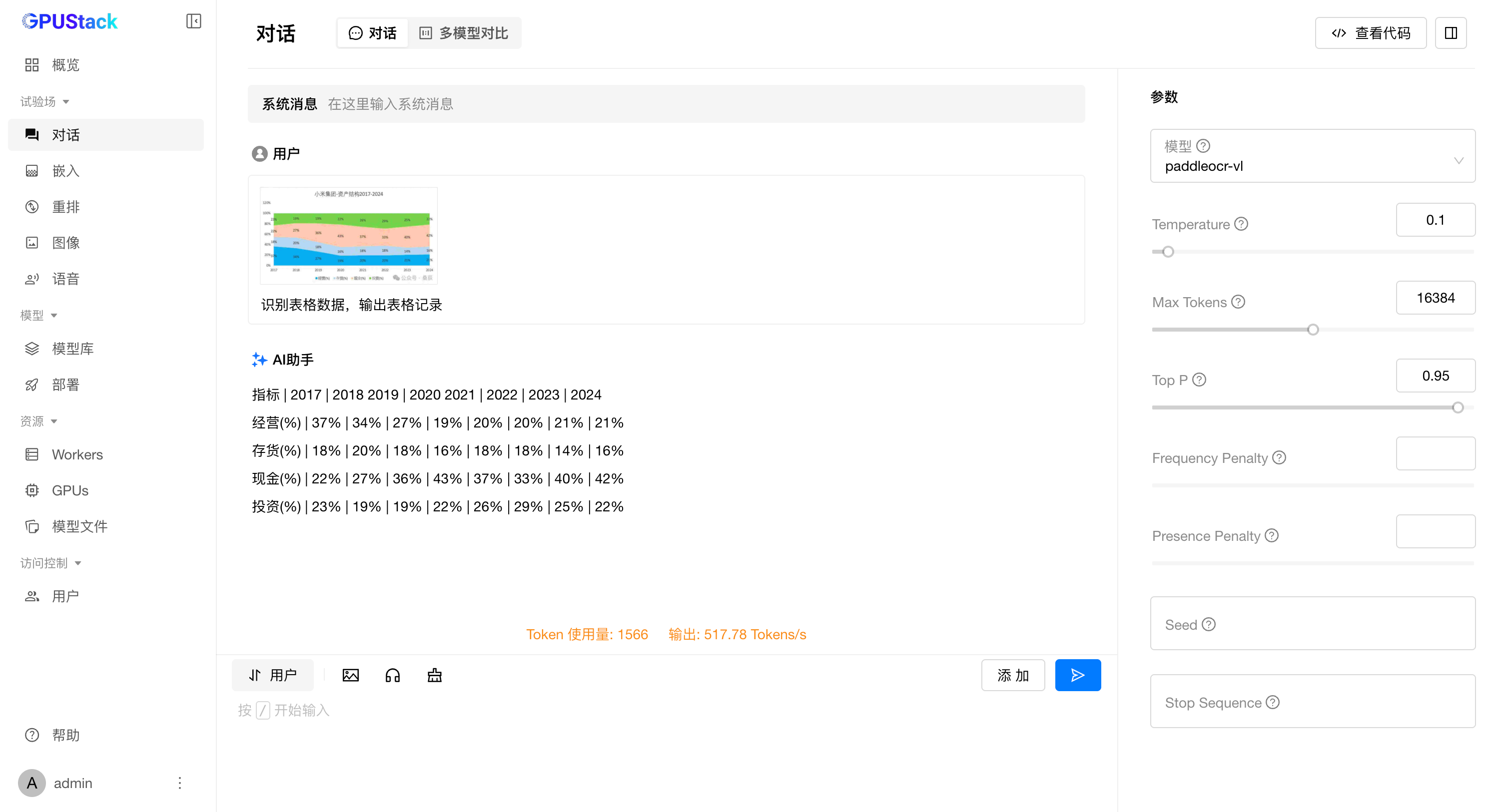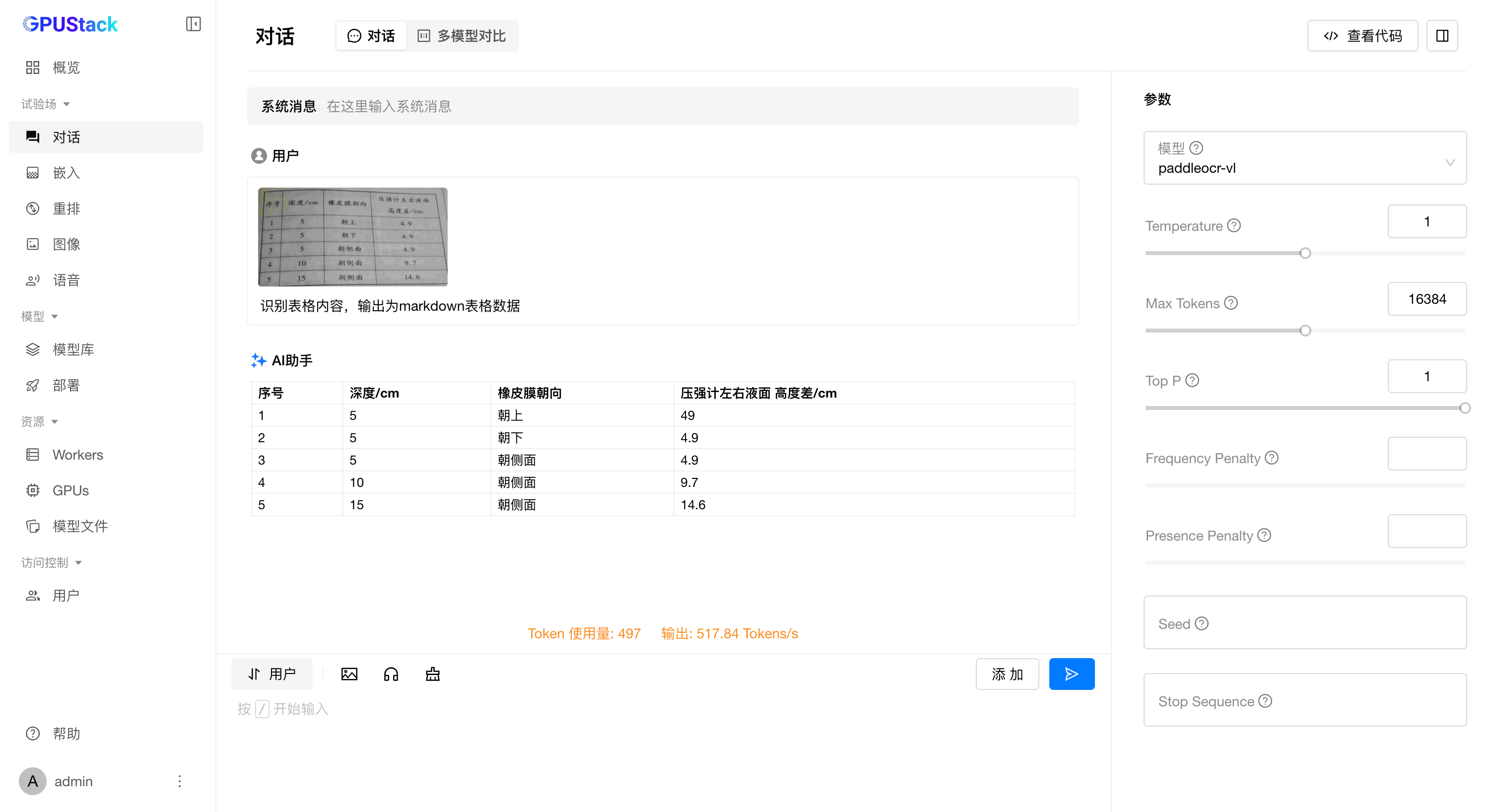 然后可以在试验场测试模型,更多用法参考 PaddleOCR-VL 官方文档: