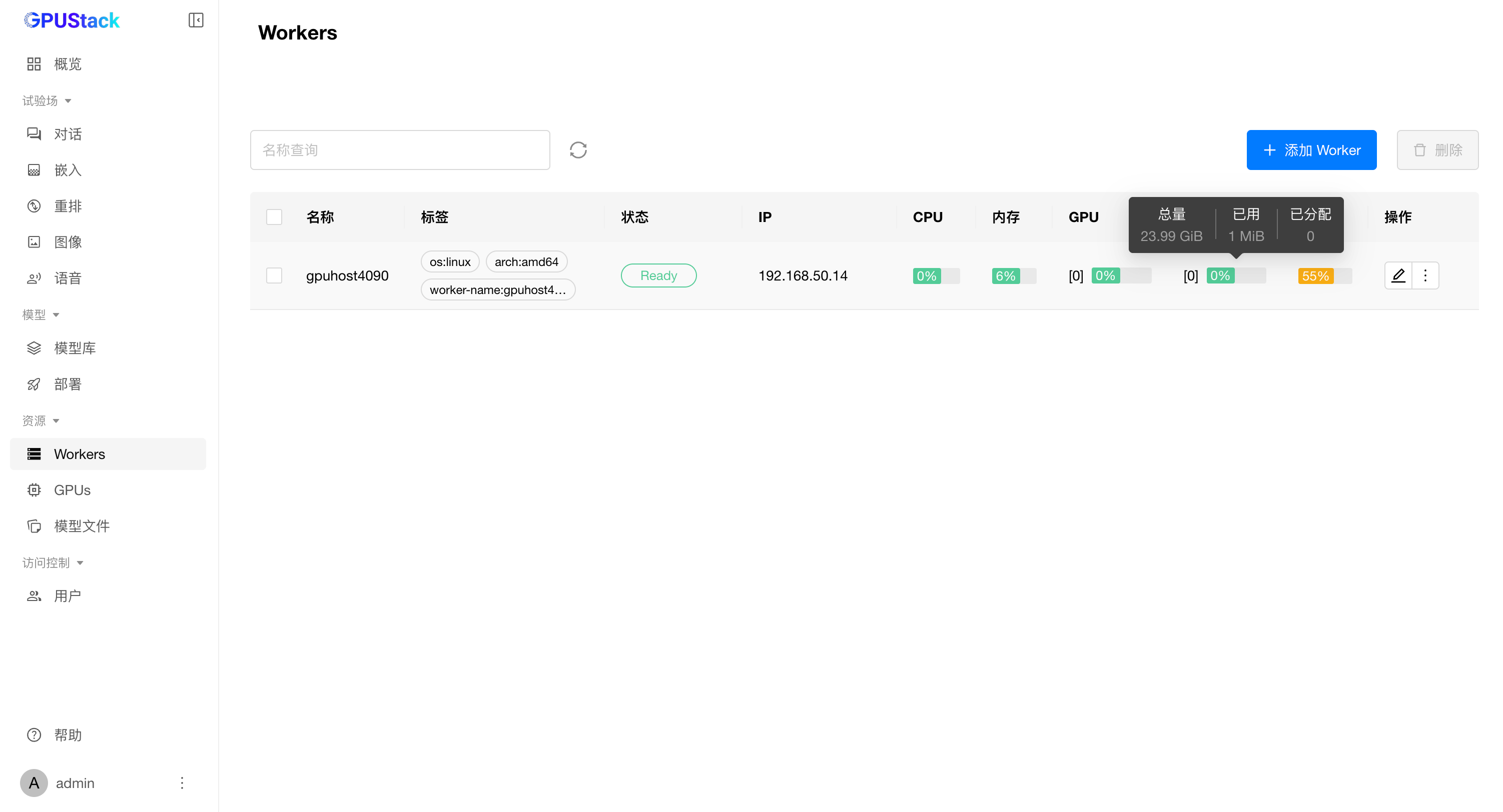 在浏览器中通过服务器 IP 和 80 端口访问 GPUStack 控制台(http://YOUR_HOST_IP),使用默认用户名 admin 和上一步获取的初始密码登录。登录 GPUStack 后,在资源菜单可查看节点的 GPU 资源: