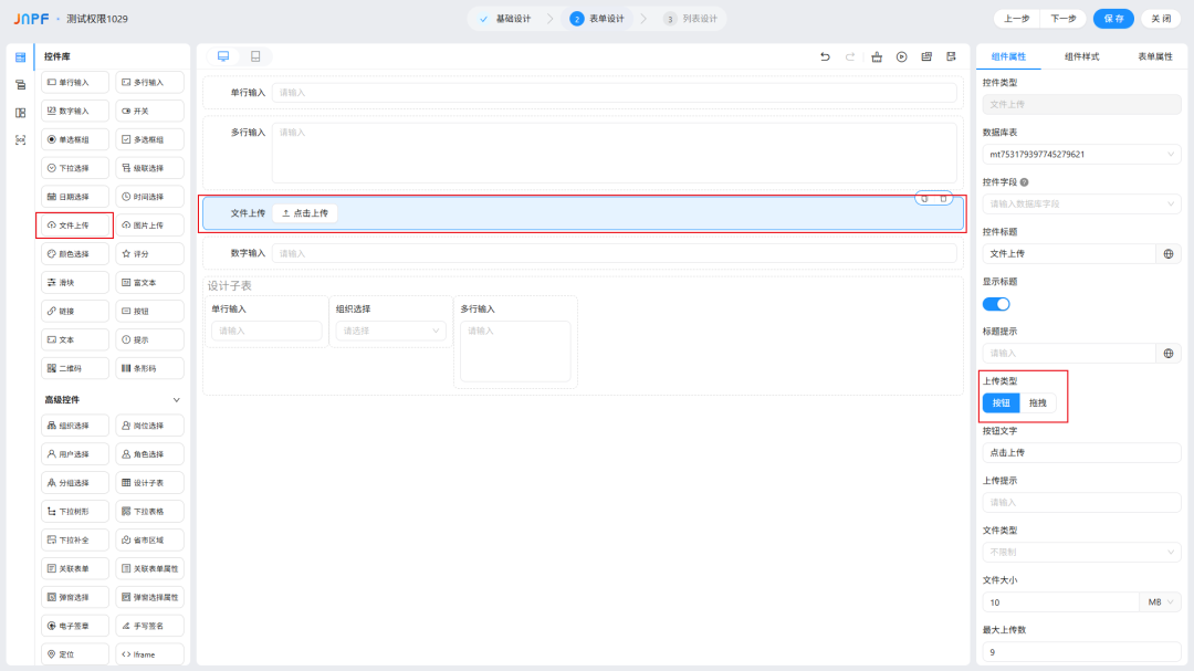文件上传控件新增“拖拽”上传类型,支持将文件直接拖拽到控件内完成上传,同时保留原有“按钮”上传方式,提升文件上传效率。
