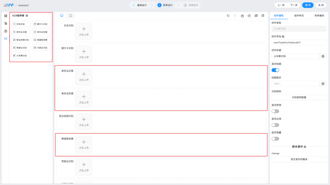 包含文本识别、身份证正反面识别、营业执照识别、增值税发票识别、驾驶证识别、行驶证识别、银行卡识别、火车票识别 8 类基础识别功能,对多种信息的快速识别和录入,将纸质文档中的信息自动转化为电子数据,填充到表单字段中。这一功能不仅提高了数据录入的速度,还降低了人工录入的工作量,提高了工作效率。
