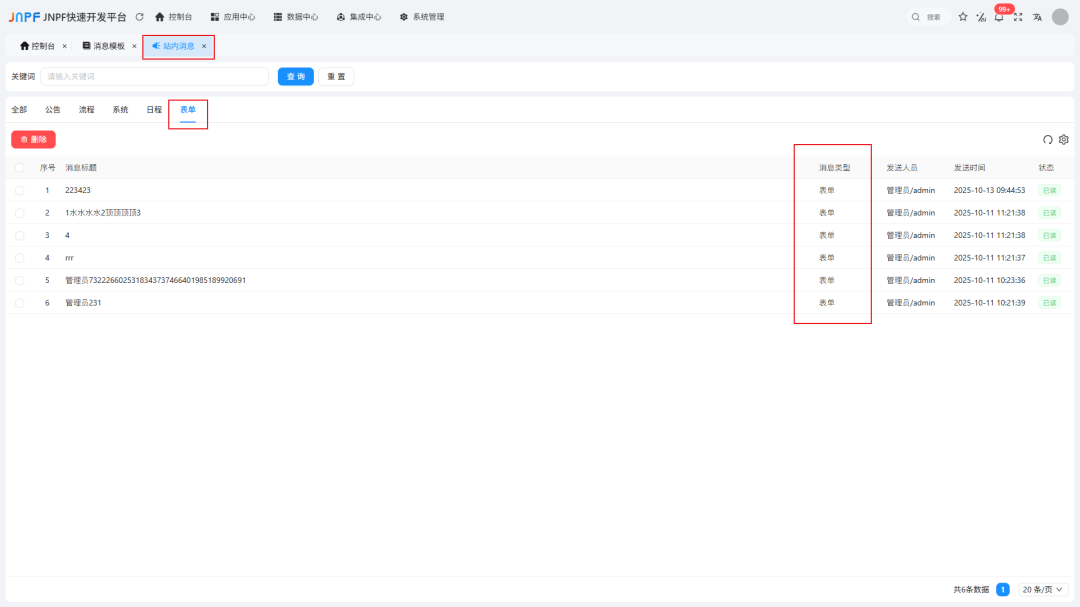 站内消息及“更多”分类中新增“表单”消息模块,点击表单类型消息将弹窗显示表单编辑界面,便于用户直接查看与处理表单相关消息。