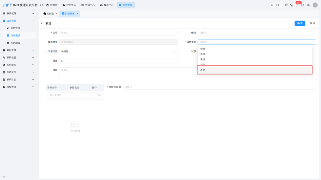 消息模板中,仅“站内信”类型支持新增“表单”消息来源,其他消息类型不支持;在流程(任务流、标准流、简单流)的“消息通知”节点中,可选择表单类型的消息模板。