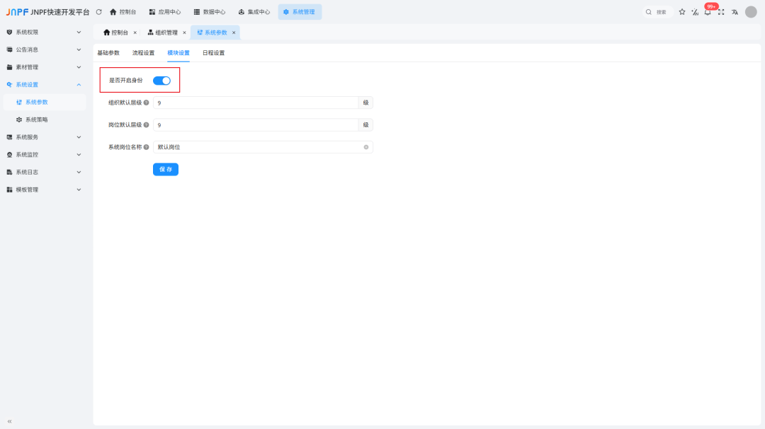 在模块设置中增加的【是否开启身份】开关,为企业提供了更加灵活的身份管理方式。当企业不需要使用身份管理功能时,可以将开关关闭,此时组织权限下将不显示“身份管理”的菜单,个人中心也不显示 “我的身份” 菜单,APP 端也不会显示“切换身份”菜单。这一设计不仅简化了界面,减少了用户的操作干扰,还在一定程度上提高了系统的安全性,避免了因身份管理不当而可能带来的安全风险。