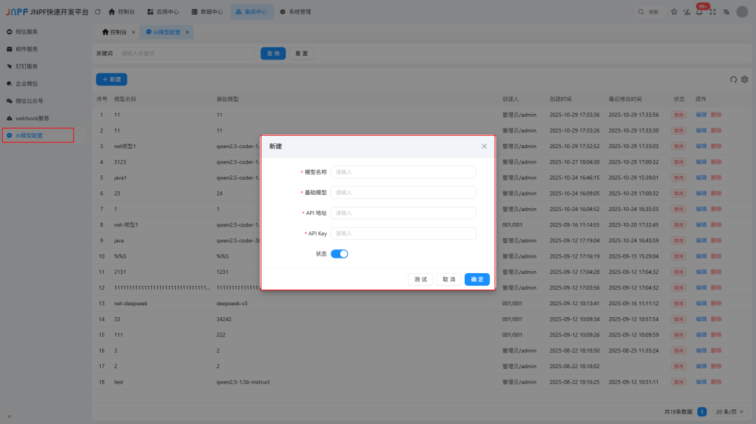 为用户提供了更加灵活的 AI 模型管理与配置能力,支持用户将自定义 AI 模型导入系统,可用于系统内所有 AI 使用场景(如 AI 建流程、AI 咨询等)。用户可以根据不同的业务场景和需求,导入、启用、切换多种 AI 大模型,并将专属模型与业务场景进行绑定,实现了 AI 能力的个性化定制,为企业提供更加精准、高效的服务,助力企业提升核心竞争力。