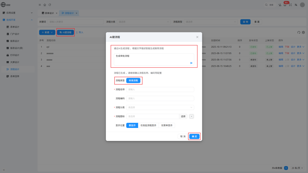 V6.1 新增的 AI 创建流程功能,该功能目前只支持标准流程,借助 AI 大模型强大的语义理解与流程建模能力,用户只需通过自然语言描述业务场景,AI 就能自动解析需求并生成符合逻辑的标准化流程。这一功能的出现,极大地缩短了流程设计的周期,降低了开发成本,让企业能够更加快速地响应市场变化,推出创新的业务应用。