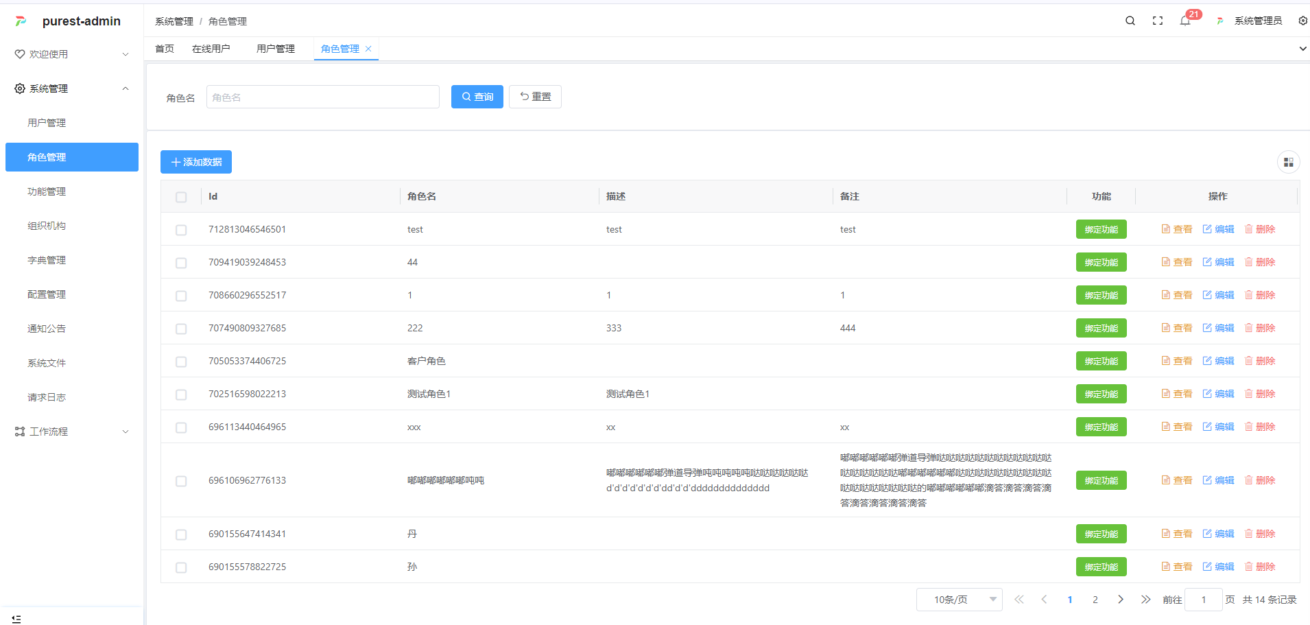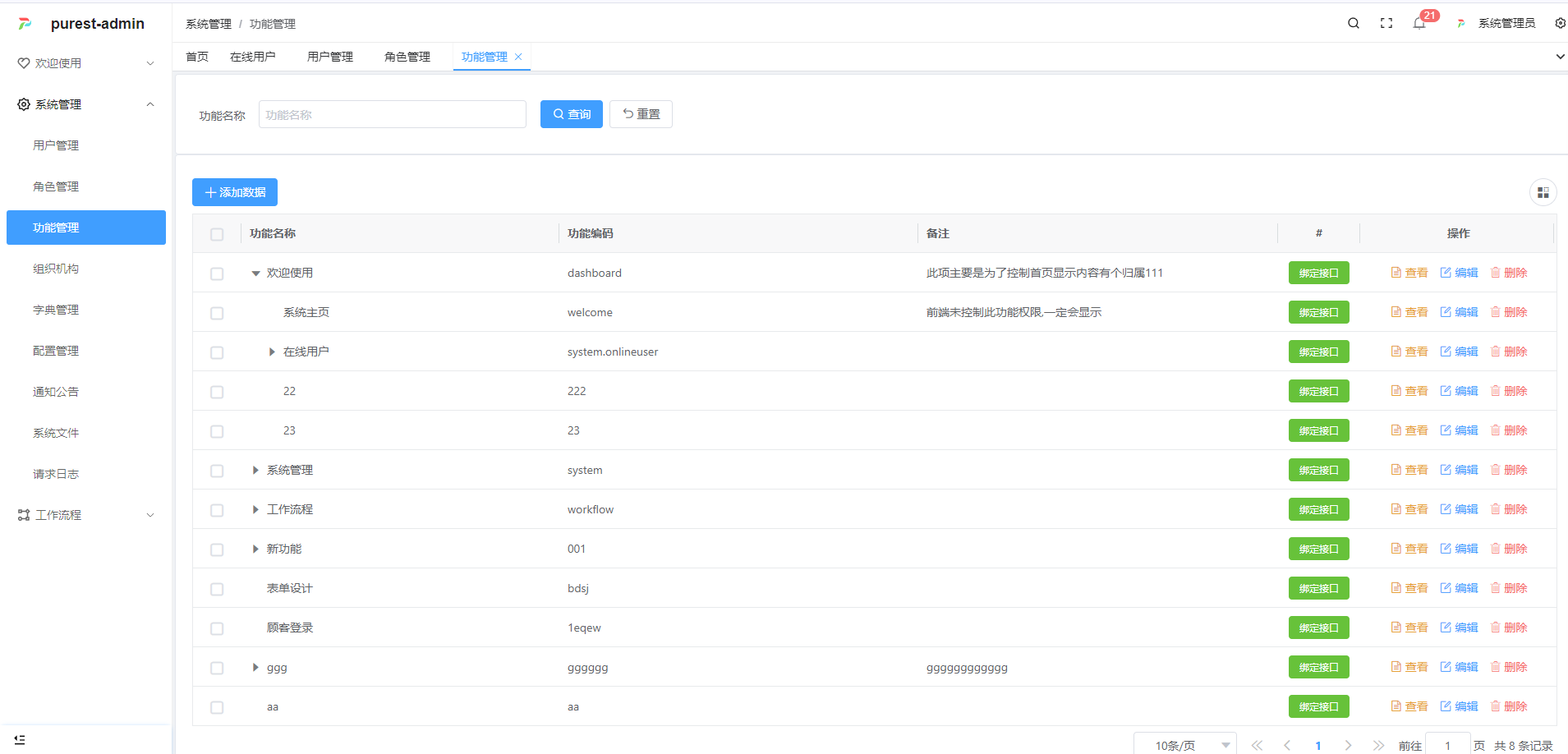 系统管理(组织架构、用户、角色、权限、功能、字典、配置等)