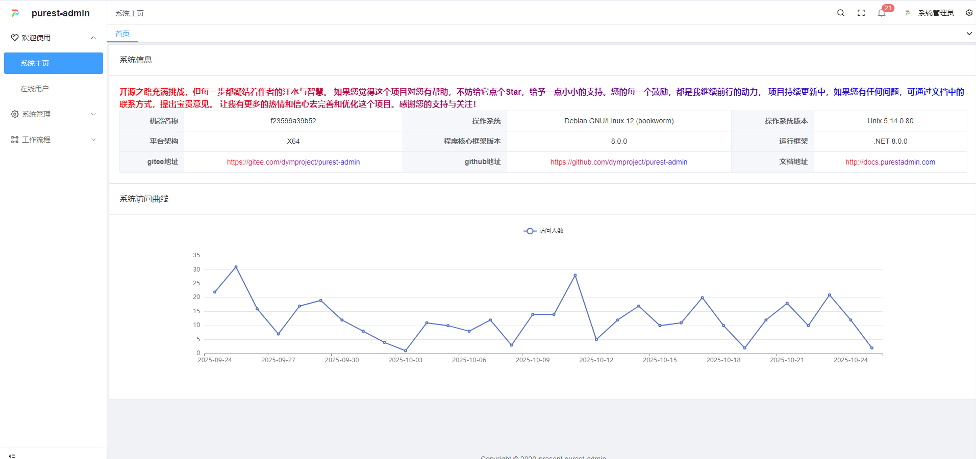 Purest Admin 是一个基于 .NET 8 + Vue3 实现的前后端分离、极简 RABC 权限管理系统,基于 LGPL-3.0 协议开源,后端在 ABP 框架的设计上进行了精简和改良,前端基于 vue-pure-admin,前端极强的表格框架 vxe-table,旨在为 .NET 开发者提供一套简洁、高效、可扩展的快速开发解决方案。