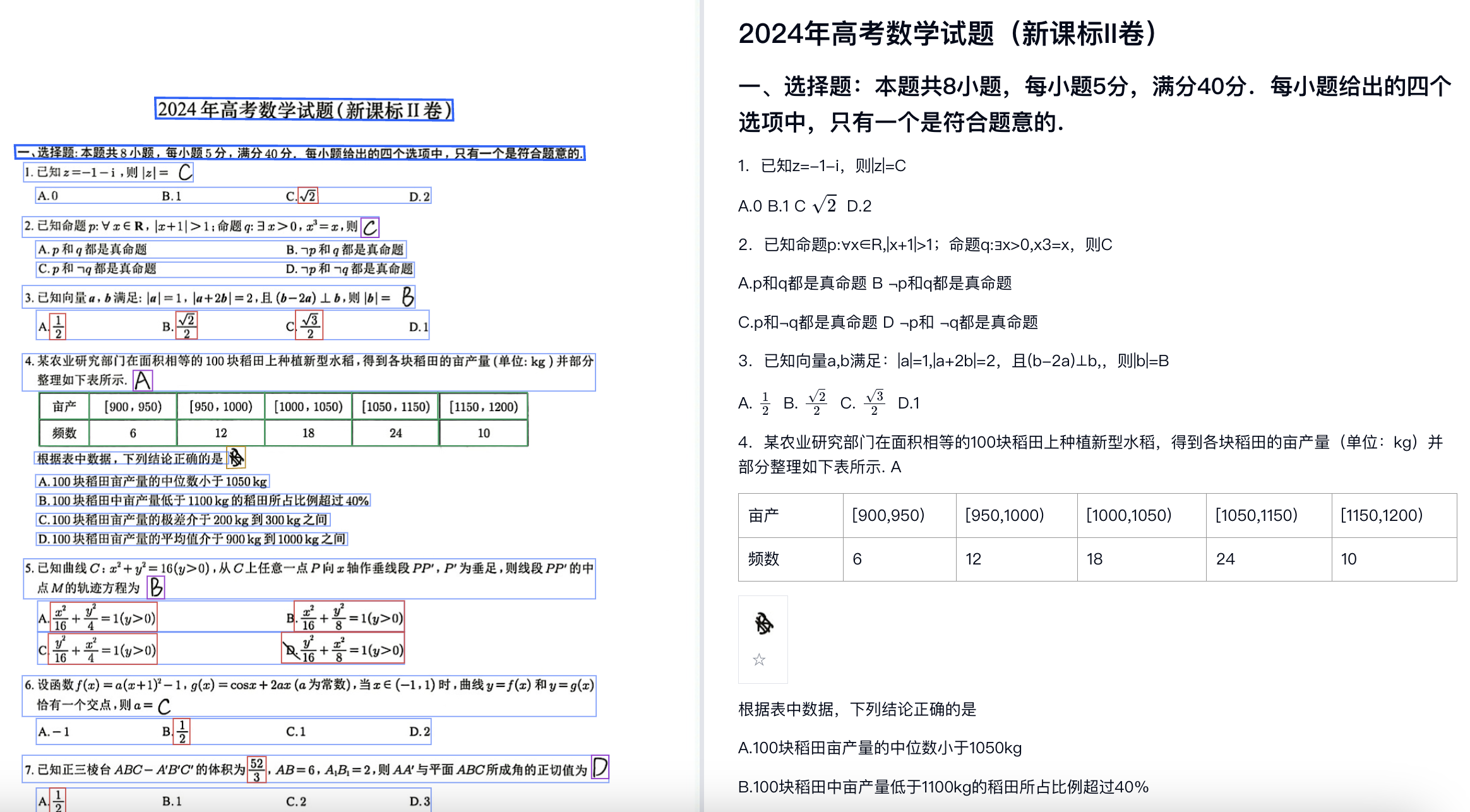 数传集团在初期使用传统 OCR 进行题目数字化过程中,曾面临公式、手写体、表格等多元素混合内容的结构化识别挑战。例如,数学试卷中的分式公式被误识别为乱码,带表格的应用题题干在转换后格式全部丢失,印刷体和手写体无法区分,输出的结果混合杂乱,编辑需花费半小时手动纠正一张试卷中的错误结果。这种“识别—校对—再识别”的死循环,严重制约了数字教材的开发进度。