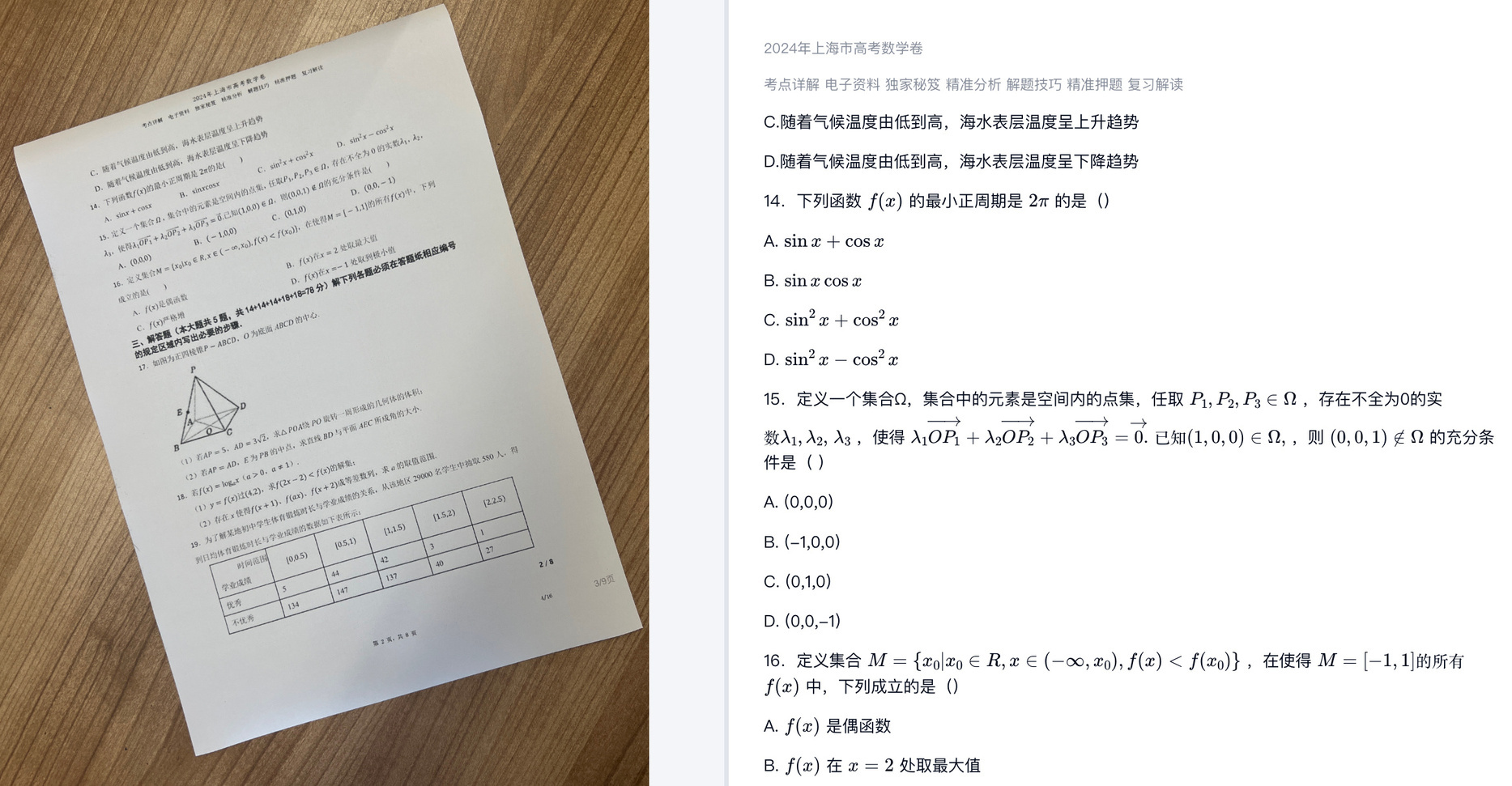 如下可以看到一份数学试题的传统 OCR 识别结果与文档解析输出结果: