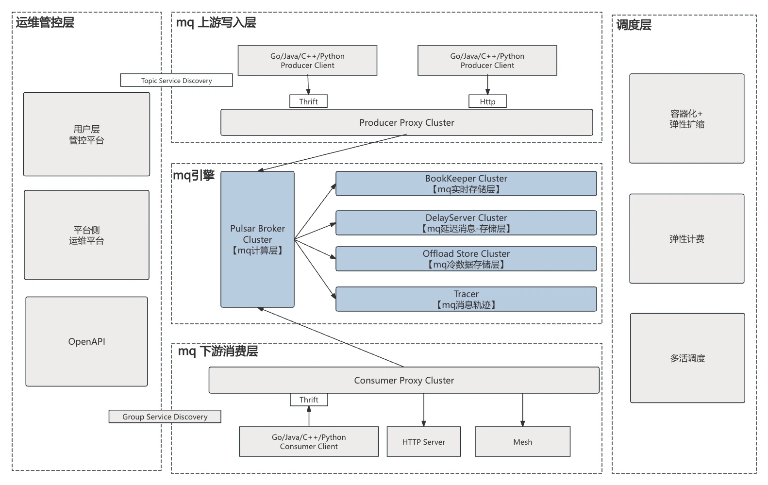 在实际落地过程中,团队对 Pulsar 进行了深度优化。针对计费场景常见的延迟消息需求,开发了 Delay Topic 和 Time wheel 两种模式,支撑超时重试和营销活动场景。引入二级 Tag 机制,在不增加 Topic 管理负担的前提下,实现了按业务代码过滤消息的能力。建设了完善的控制台系统,实现对消息全生命周期的追踪管理,包括消息内容查询、生产者溯源和消费状态监控。构建了多维监控告警体系,通过积压告警、延迟告警和失败告警等机制,确保系统异常能够秒级发现并及时处理。