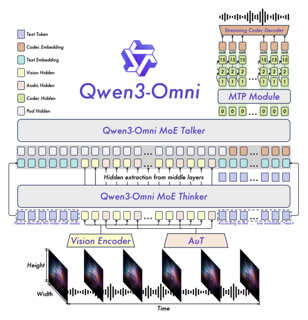 阿里巴巴 Qwen 团队近日震撼发布其最新一代 30B 参数「全模态 AI 大模型」Qwen3-Omni。这是全球首个真正端到端的开源多模态模型,能够同时处理文本、图像、音频、视频输入,并实时生成流式文本和自然语音输出。其性能在多项评测中已直逼 OpenAI 的 GPT-4o 和 Google 的 Gemini 2.5 Pro,为多模态 AI 交互树立了新标杆,并支持免费商用。