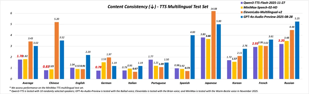 多语种多方言能力持续增强:Qwen3-TTS 支持中文、英文、德语、意大利语、葡萄牙语、西班牙语、日语、韩语、法语、俄语等 10 大主流语言,在 MiniMax TTS multilingual test set 上,平均词错误率(WER)优于 MiniMax、ElevenLabs 及 GPT-4o-Audio-Preview。支持更多音色的方言生成,包括普通话、闽南语、吴语、粤语、四川话、北京话、南京话、天津话和陕西话,真实还原地方口音特色与语言神韵。