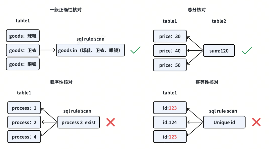 一般正确性校验:例如某些支付业务只能用于特定的商品类型,则可以通过自定义 SQL 校验规则来进行校验。
