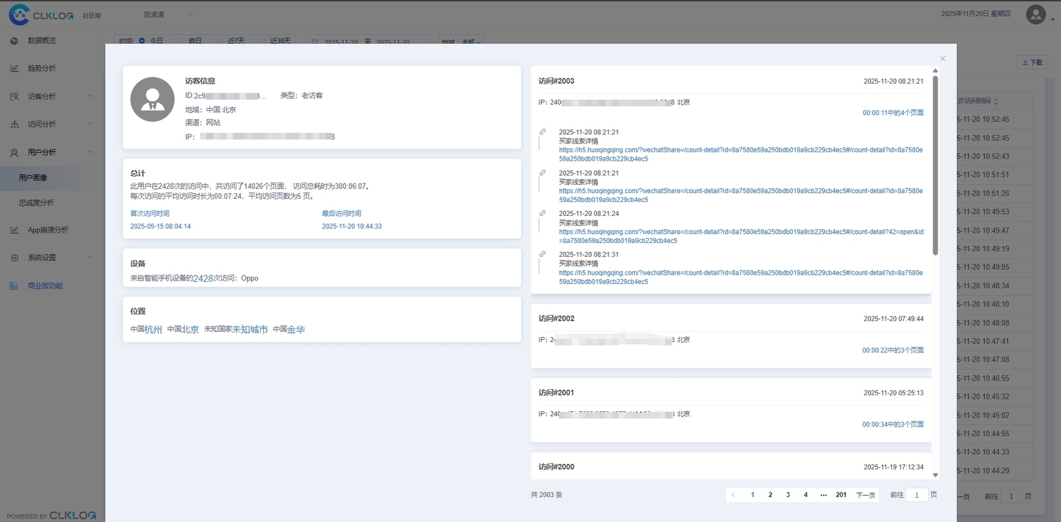 ➢ 【用户画像(社区版)】汇总用户的基础访问信息、访问信息总数、设备、位置与访问历史,可以快速了解用户特征。