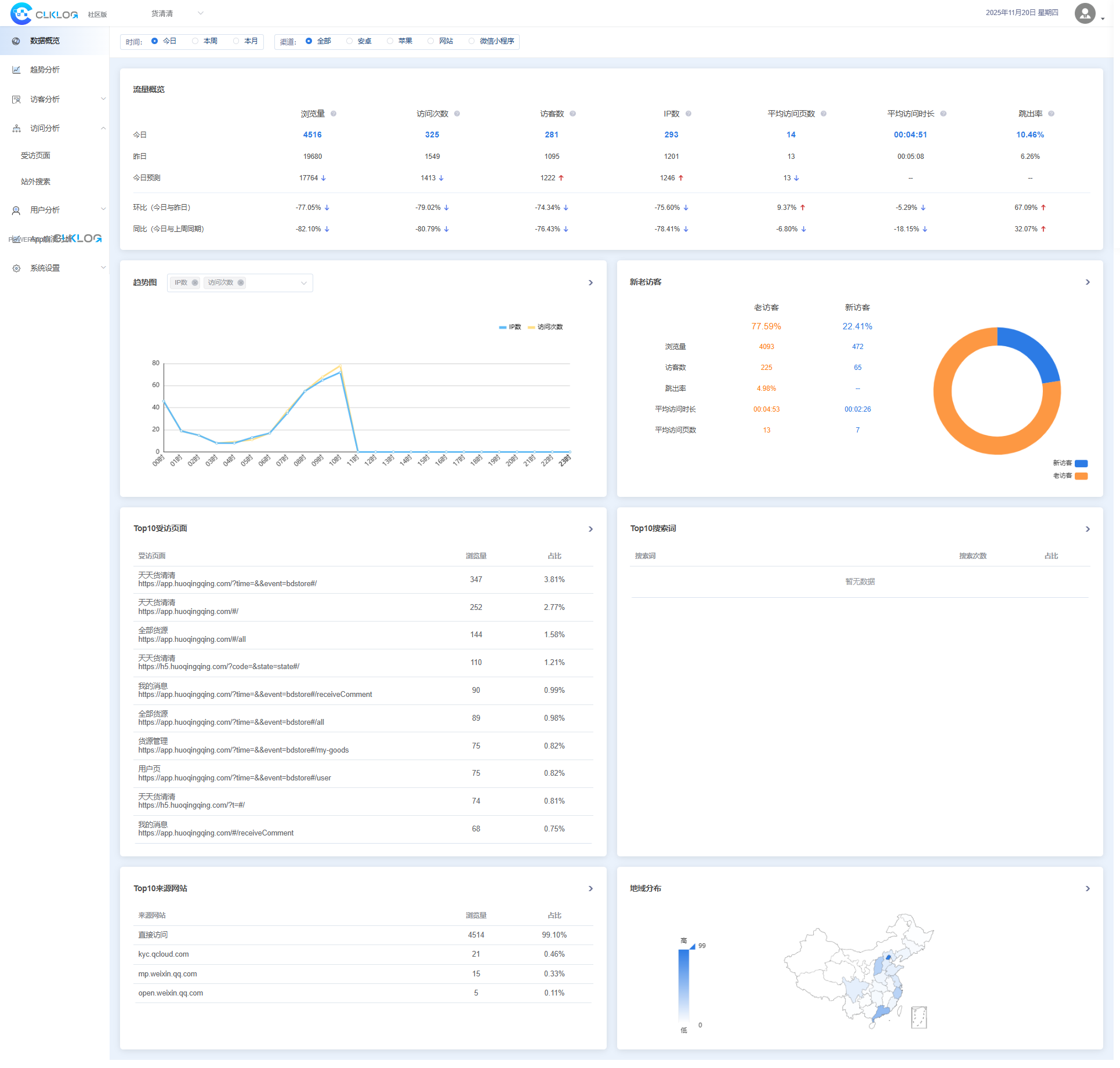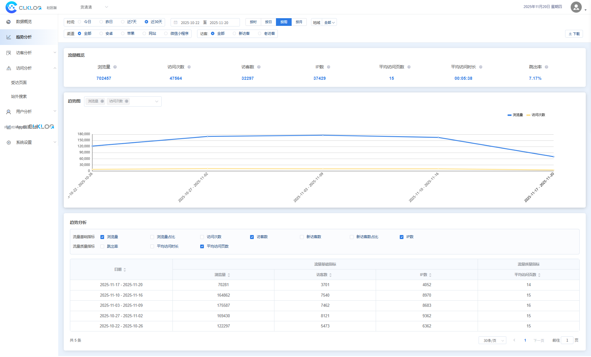 ClkLog 是一款可私有化部署的开源用户行为数据分析系统,支持 Web、App、小程序、鸿蒙 OS 等端的事件埋点采集,内置多种主流分析模型,帮助团队快速搭建自有埋点分析平台,实现访问统计、事件分析、用户画像等能力。