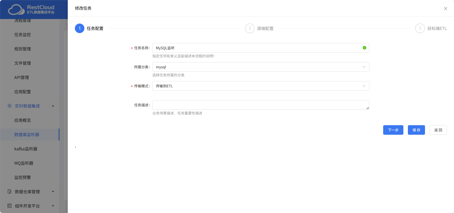 任务名称和所属分类根据需要填写,所属分类可以在分类管理里创建。支持多种传输模式,这里选择传输到 ETL。