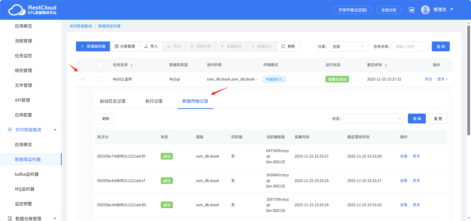触发数据变动,查看数据传输情况,可以看到数据监听并同步成功。