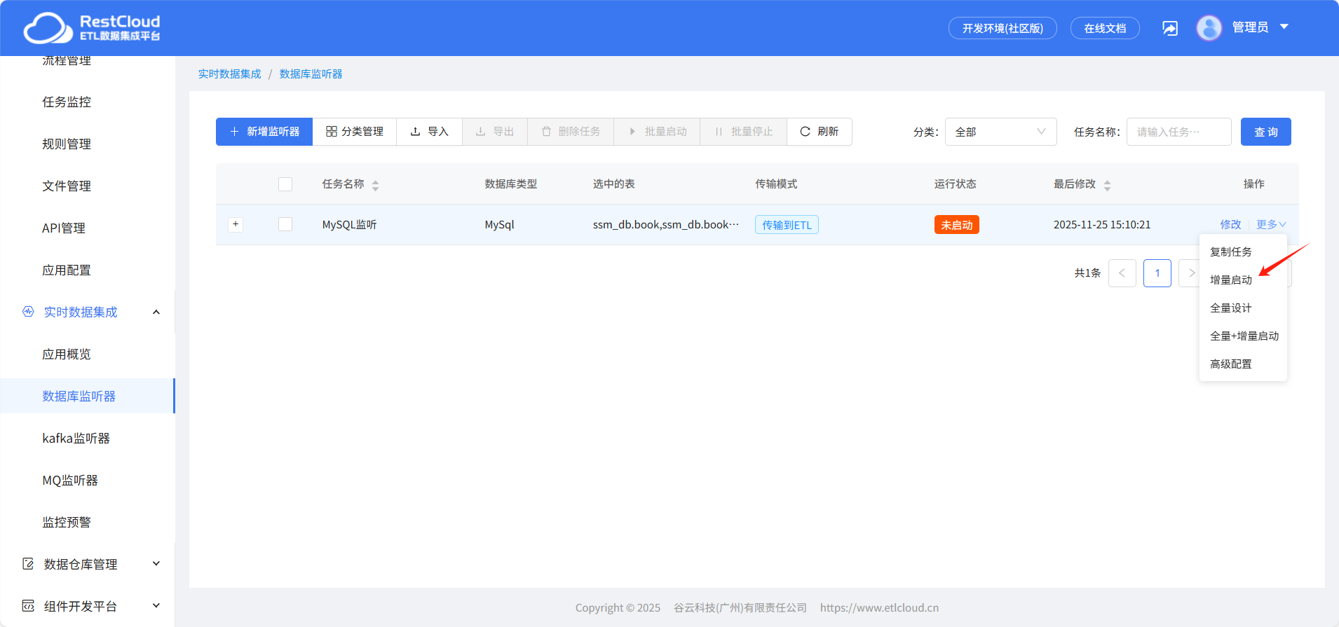 在数字经济加速渗透的今天,数据已成为企业核心竞争力的关键载体。然而,企业在数据处理过程中始终面临着一个核心抉择:是选择实时 ETL 满足即时决策需求,还是依赖批处理保障海量数据高效处理?两种模式看似对立,实则各有适配场景 —— 实时处理擅长低延迟响应,批处理则在高吞吐量、低成本运算中占据优势。如何打破模式壁垒,实现 “鱼与熊掌兼得” 的混合架构部署?下面将演示使用 ETLCLoud 的实时监听多表同步的案例。