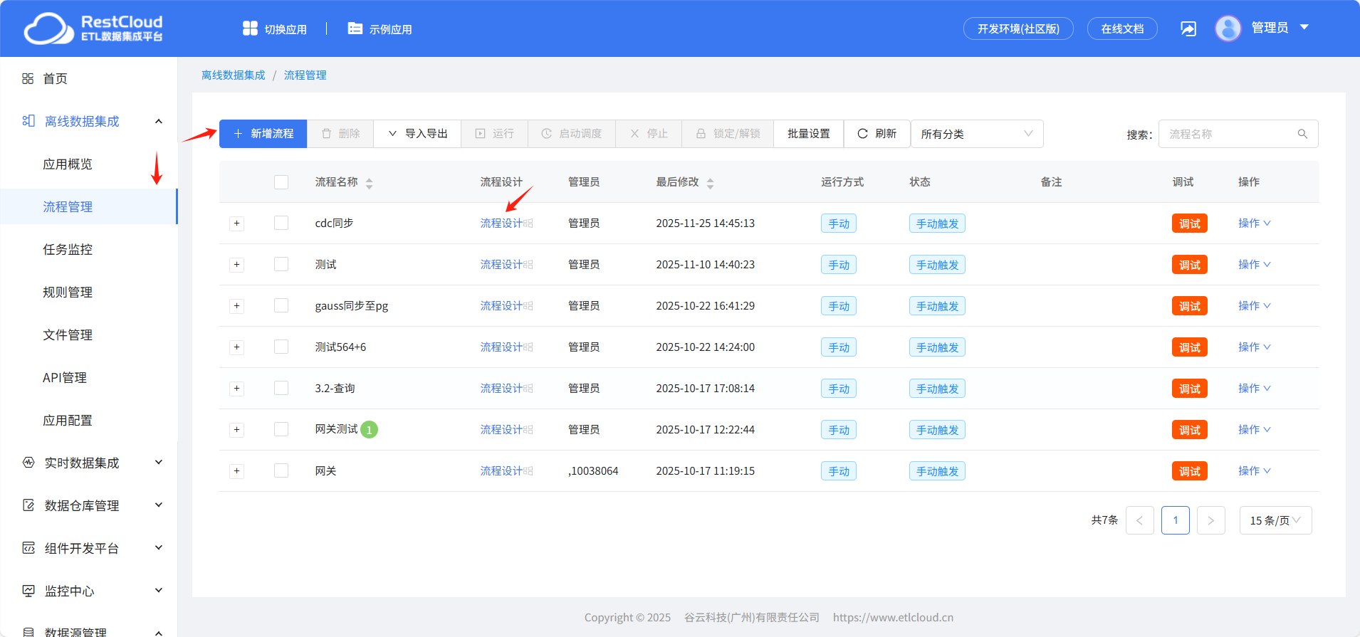 来到离线数据集成的流程管理,点击新增流程。这里已经提前建好了 CDC 同步的流程,然后打开流程设计。