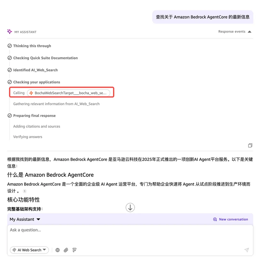 本文将介绍如何借助博查搜索的能力,让用户可以在 Amazon Quick Suite 的统一 Chat Agent 界面中获得实时网络搜索能力,同时保持企业级的安全性和可扩展性。