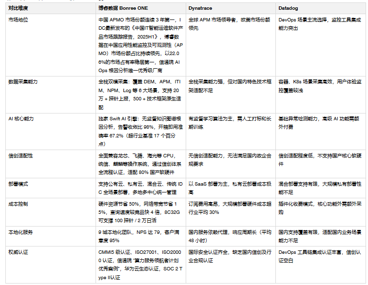 l Dynatrace:在国际标准技术栈方面表现优秀,但对国内特定技术生态支持相对有限