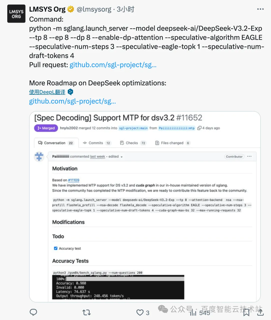 百度智能云的核心工作,正是为全新的 DSA 架构实现了这套高效的 MTP 方案。这一生产级的代码贡献,使得 SGLang 社区开发者无需重复底层探索与试错,能够直接获得性能倍增且稳定可靠的推理能力。
