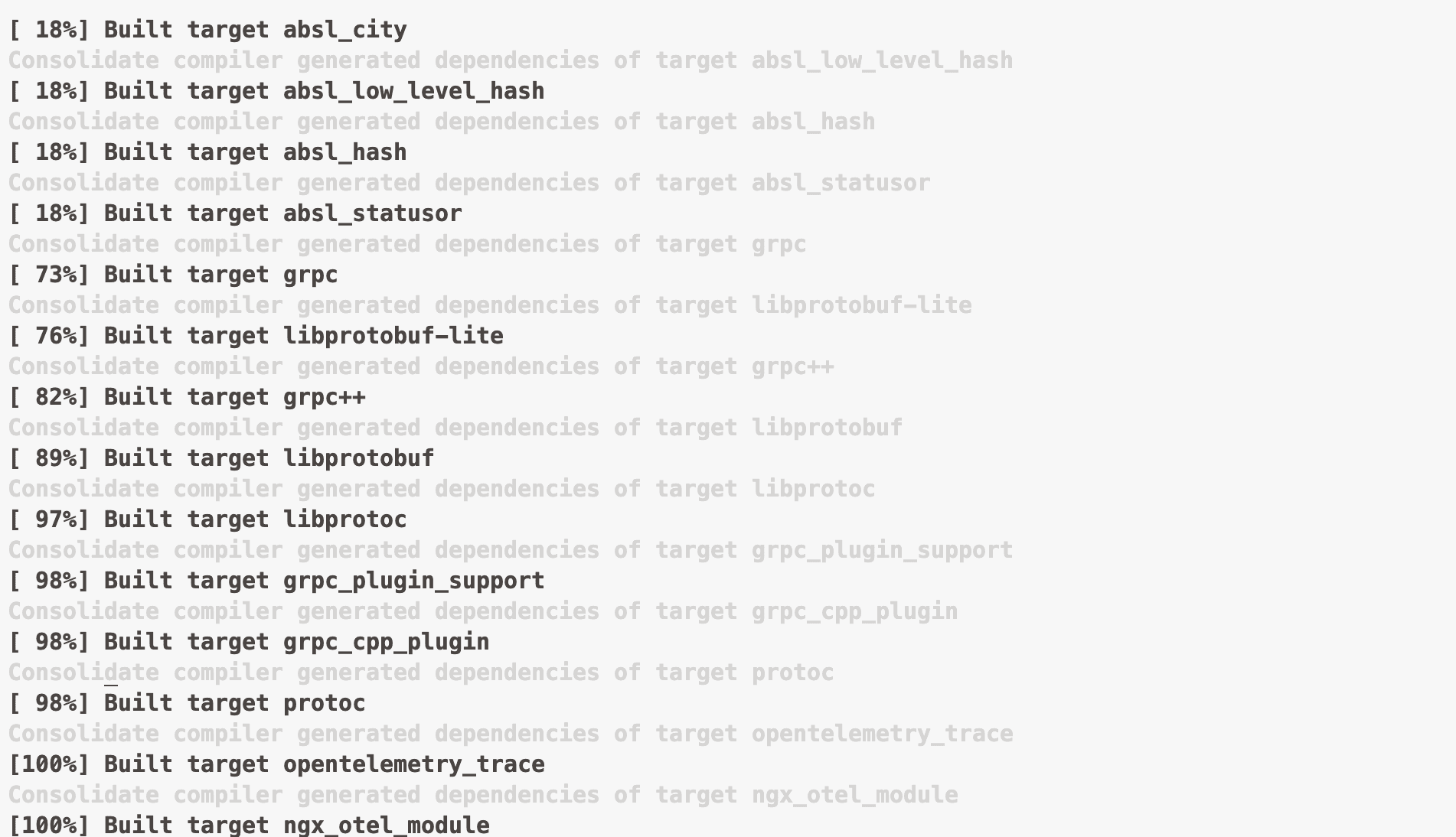 mkdir buildcd buildcmake -DNGX_OTEL_NGINX_BUILD_DIR=/nginx/objs ..make