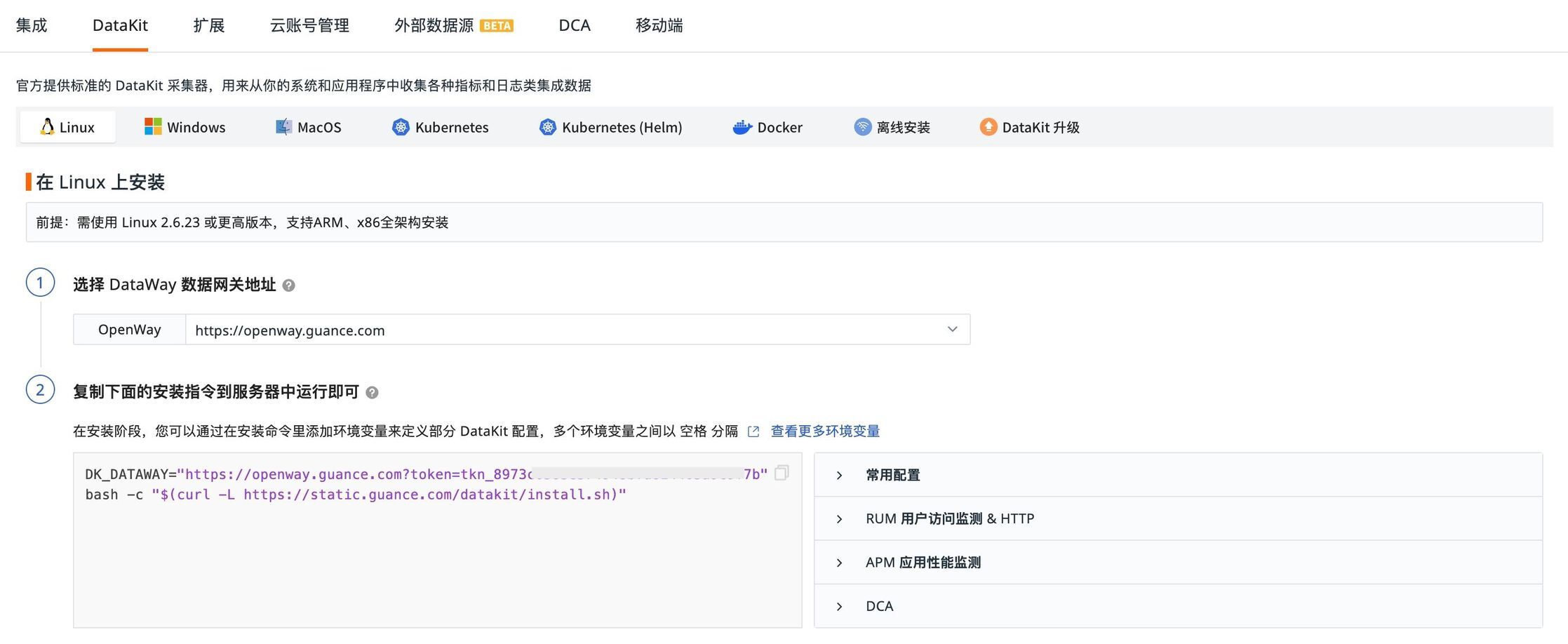 登录观测云控制台,点击「集成」-「DataKit」-「Linux」,复制安装命令在服务器执行即可。