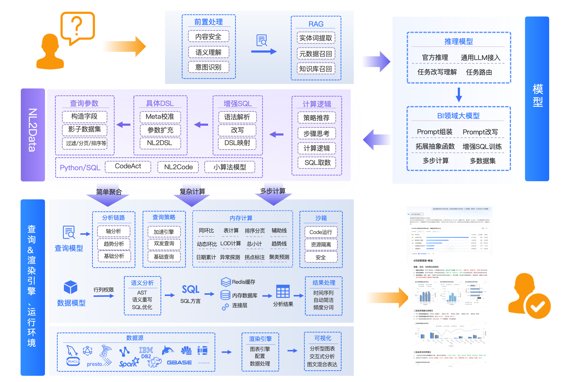 总结来说,NL2DSL 路线是有 BI 产品基础的厂商首选的技术路径,因为过去大量的分析能力的积累、数据语义构建的基础、数据权限的管控、丰富数据源类型的兼容、海量数据查询加速、可视化展示与交互,所有这些数据产品的关键能力都能马上复用,带来极好的用户体验。