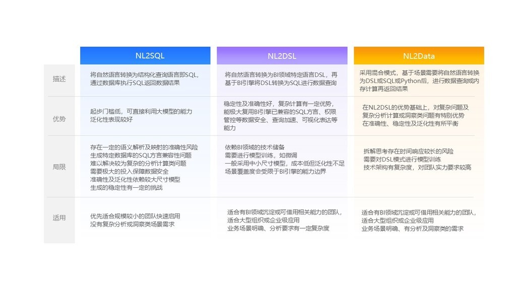当前主流的智能问数技术路线是 NL2SQL 和 NL2DSL,同时有技术实力的团队进入到更具融合性的阶段,也被统称为 NL2Data 技术路线。