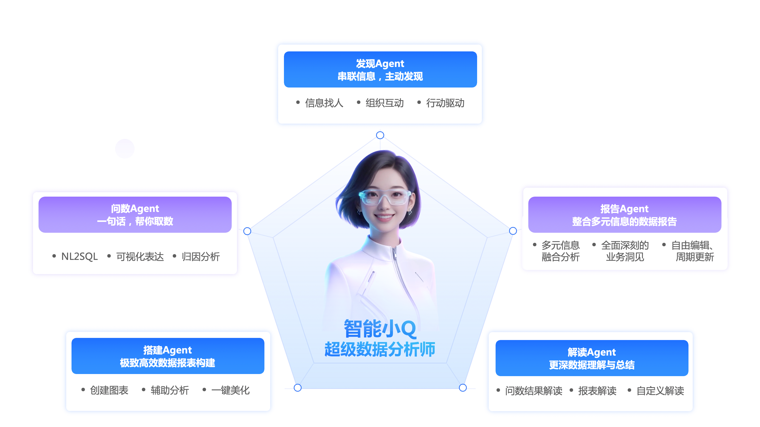 通过复用多年积累的全链路数据能力与企业级服务经验,Quick BI 推出的数据分析 Agent 智能小 Q 深度嵌入了现有 BI 体系并作为智能化中枢助力产品突破瓶颈,实现快速复用数据连接、权限管控、可视化图表等成熟模块,形成了开箱即用的落地优势。
