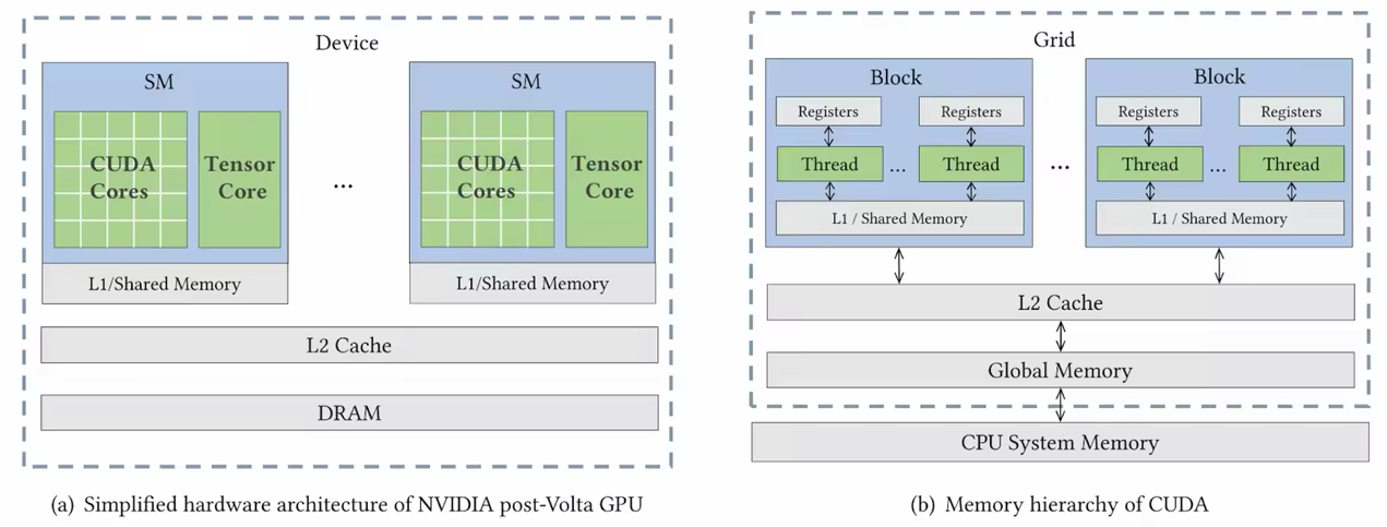 随着 2017 年 Volta 架构的推出,Nvidia GPU 加入了 Tensor Core 硬件单元,该单元专门用于加速矩阵乘法计算,使得 GPU 的计算能力进一步提升。