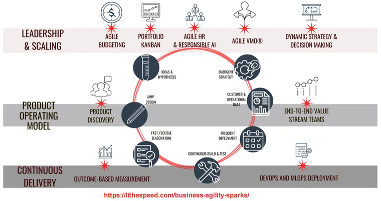 敏捷 VMO 并非孤立存在,而是嵌入在“业务敏捷火花”(Business Agility Sparks®) 这一整体运营模型中。该模型整合了: