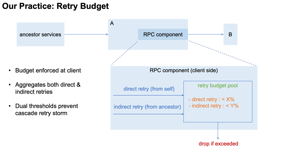 我们对系统自身的改进是建设一系列的"自愈"能力。首先是"重试预算",用于在 client 侧就地收敛重试风暴。每个请求携带"全链路重试状态"信息,RPC 组件据此识别两类重试:直接重试(本服务对下游)与间接重试(上游祖先节点发起)。RPC 组件维护一个"预算池",对两类重试流量配置不同的预算阈值,超过预算即快速失败。预算策略会随后端服务容量自适应调整,以充分使用后端容量。该机制把自增负载限制在可控范围内,避免指数级扩散。
