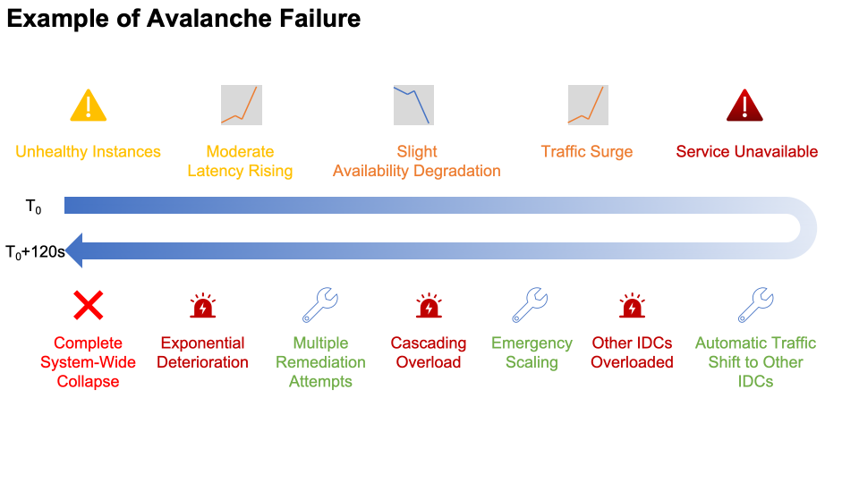 这里举一个真实的例子给大家直观感受雪崩的威力。在一个 IDC 中,少量实例出现轻微健康退化,引发中等程度的延迟上升和轻微的可用性下降——没什么令人担忧的,只是典型的小波动。几乎同时,随着上游重试机制启动指数退避策略,流量迅速激增,导致服务在几秒内变得不可用。