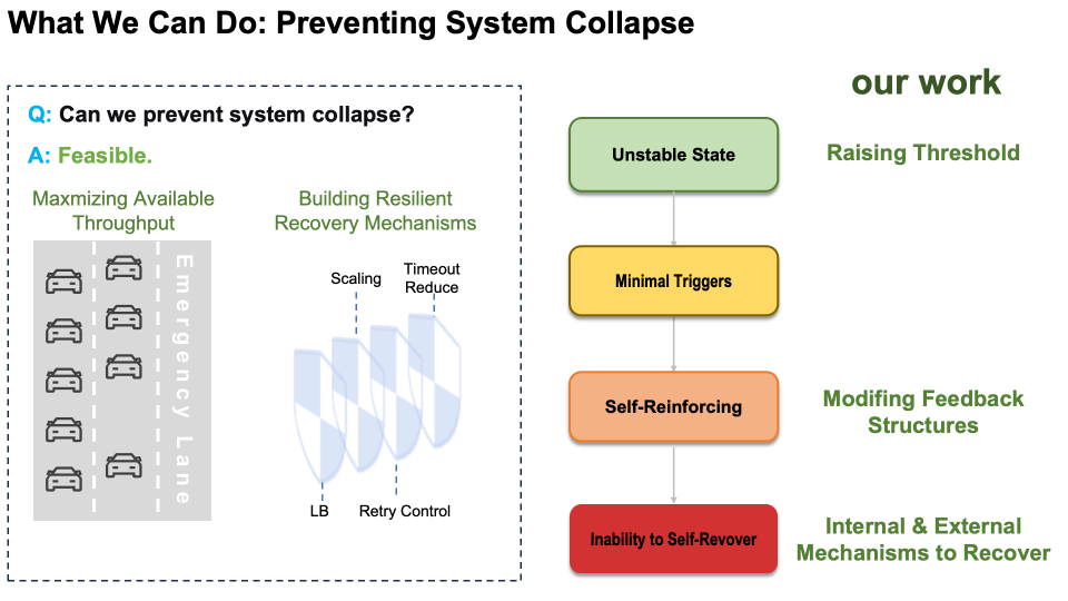最后,我们来探讨能否防止系统崩溃。这是可行的,主要通过两种互补的方法:最大化可用吞吐量与构建弹性恢复机制。即使系统超越临界阈值,我们仍可通过建立内部容错机制与外部干预预案,避免系统全面崩溃,并为系统创造多次恢复机会。
