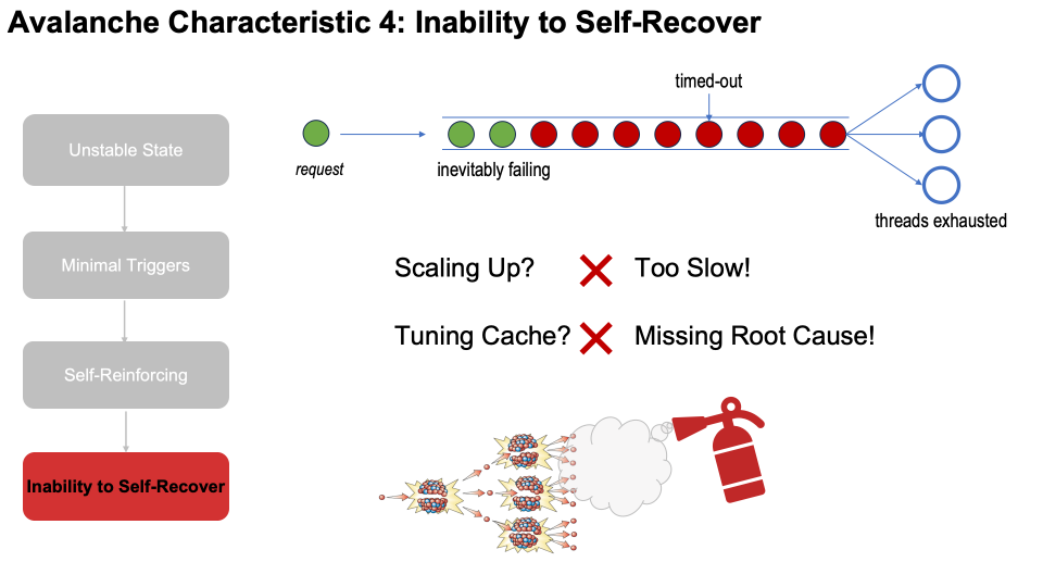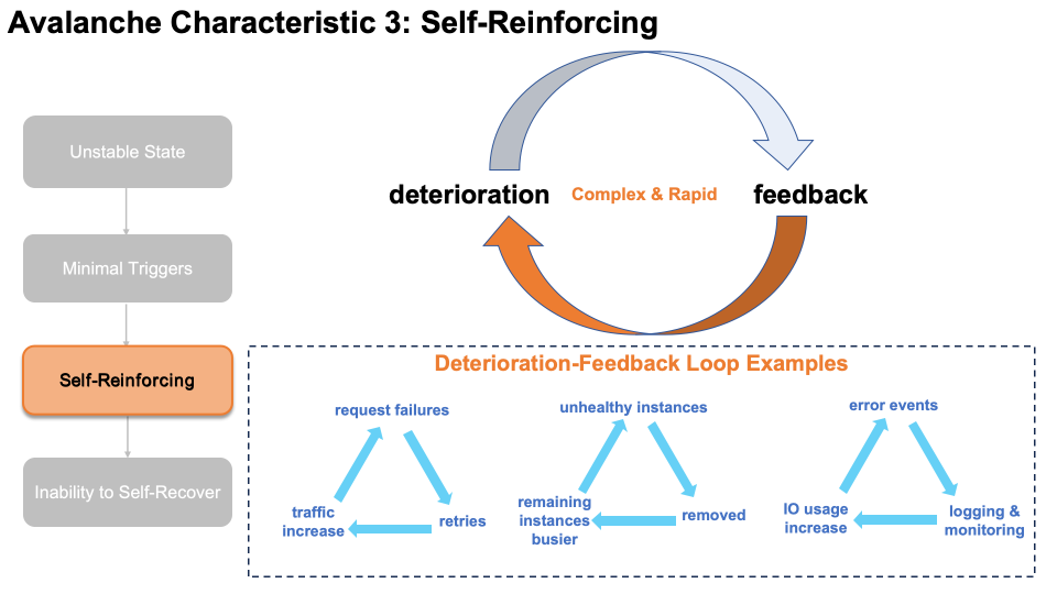 一旦越过临界点,系统会迅速进入自强化阶段,这是雪崩最典型的一个特点。在这种情形下,高可用优化机制统统都站到了反面。系统每增加一点恶化,高可用机制就产生一些正向反馈,从而导致进一步恶化。这条恶化-反馈循环持续加强,复杂且迅速。图中展示了几个例子。回路一:请求失败导致重试,然后导致负载上升,进而导致更多失败,最终形成指数级的重试风暴;回路二:少量实例略不健康导致被摘除,然后导致剩余实例更忙,进而导致更多实例被判不健康,最终引起容量指数级退化;回路三:错误事件导致大量的日志和监控,然后导致 I/O 用量上升,进而导致更多错误,最终使性能进一步恶化。