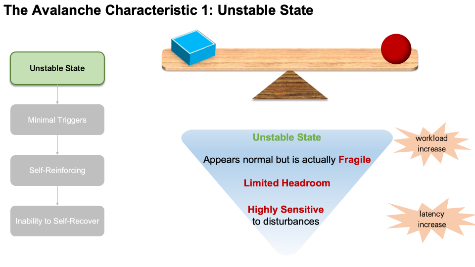 以上,我们直观感受到了雪崩的威力。那么,什么是雪崩?让我们从 4 个雪崩的特点来介绍雪崩。雪崩发生前,系统都会首先进入“非稳定”状态,这种状态“貌似正常、实则脆弱”。各项指标也许还在阈值内,但可用余量极少,表现为:负载上升,延迟上涨……此时的系统对扰动极为敏感,任何轻微扰动都会使它偏离稳定状态。